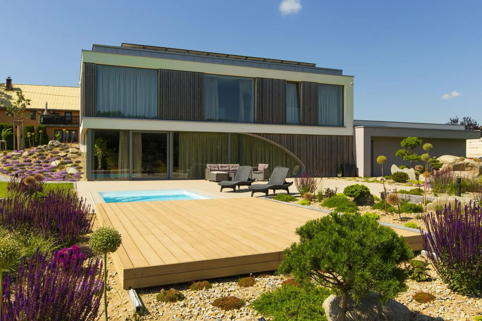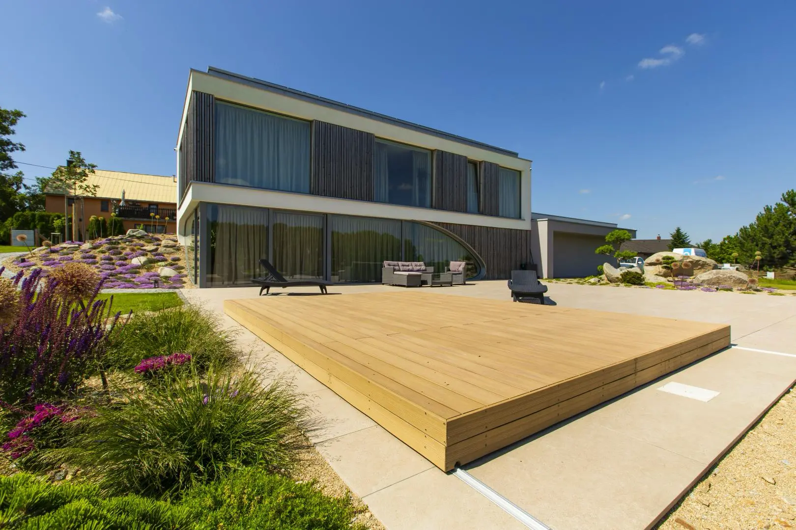 Výsledkem realizace na Ústecko-Orlicku je dokonalá symbióza mezi pochozím zastřešením, zahradou a rodinným domem. Zastřešení SlideWood pouze podtrhuje krásu zahradního konceptu, nijak ho nenarušuje a přispívá k celkové atmosféře klidu, přírody a relaxace. Barevný povrch zastřešení ladí s okolními barvami a taktéž výška bazénového krytí navazuje na přilehlý záhon.