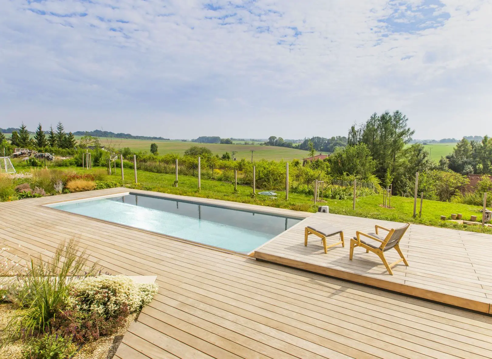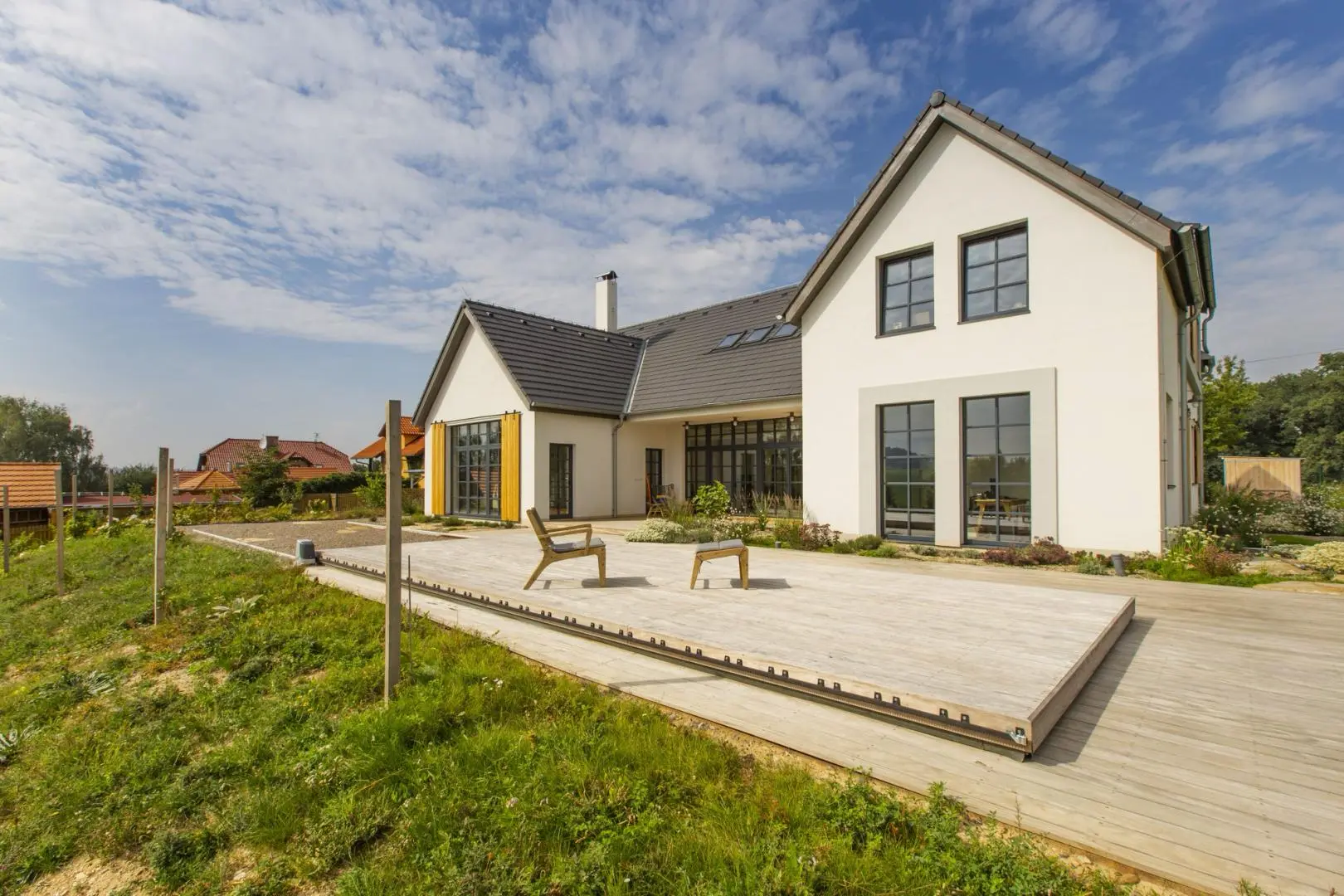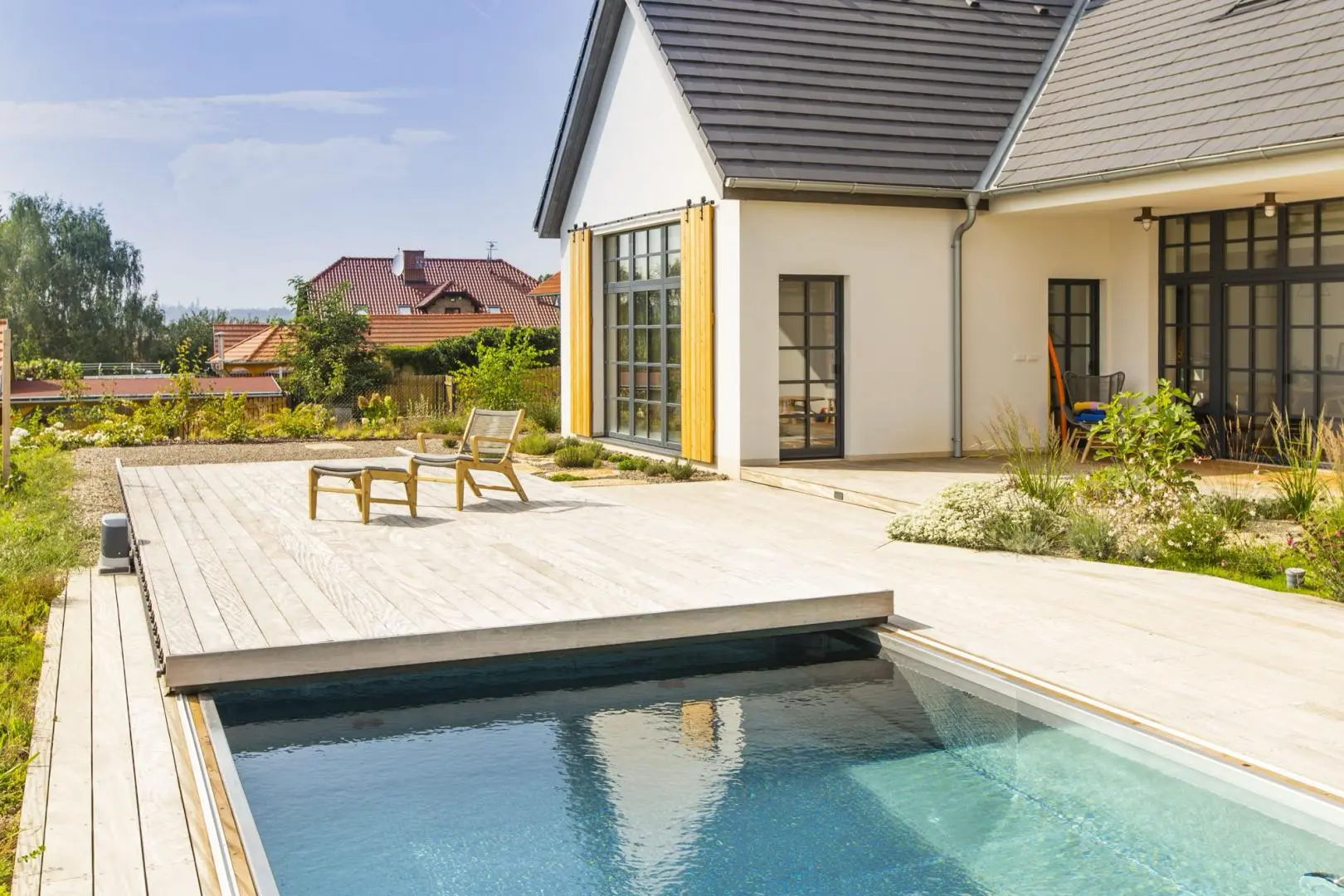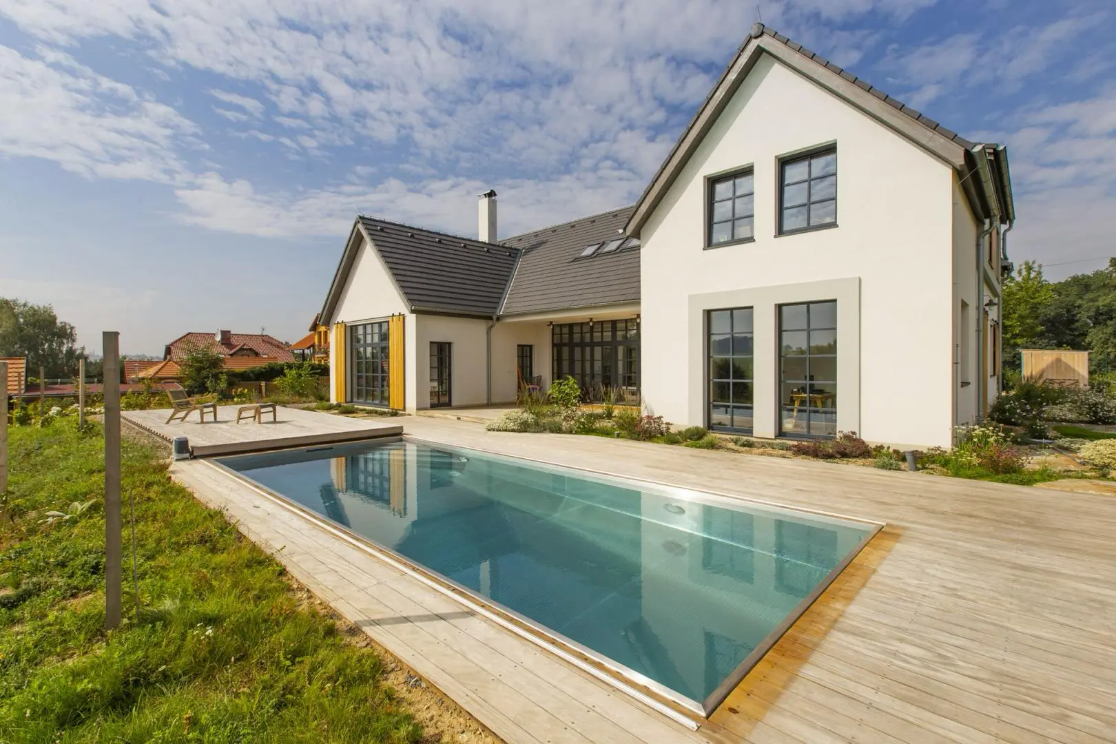 Kousek za Prahou, v odlehlé části Číčovic, se nachází moderní dům ve venkovském stylu. Zadání od majitelů, bylo vyrobit kryt na bazén, o rozměru 9,8 x 3,8 metrů, který žádným způsobem nenaruší koncept zahrady a domu. Na tomto zastřešení vyniká krásné exotické dřevo garapa.
