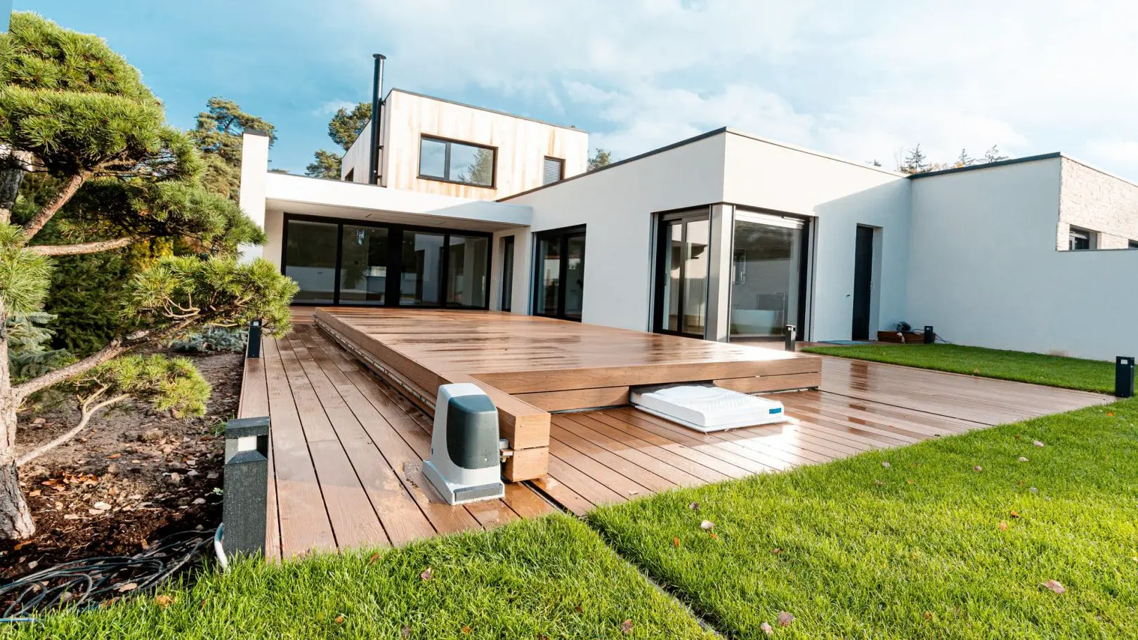 Zakrytí bazénu RD Klánovice. Opět se zde ukazuje perfektní využitelnost pochozí pojízdné terasy nad bazénem v souvislosti s malým pozemkem zahrady. Odlišností zde je vyříznutí otvoru v zastřešení, pro odsun, přes zařízení protiproudu v bazénu.