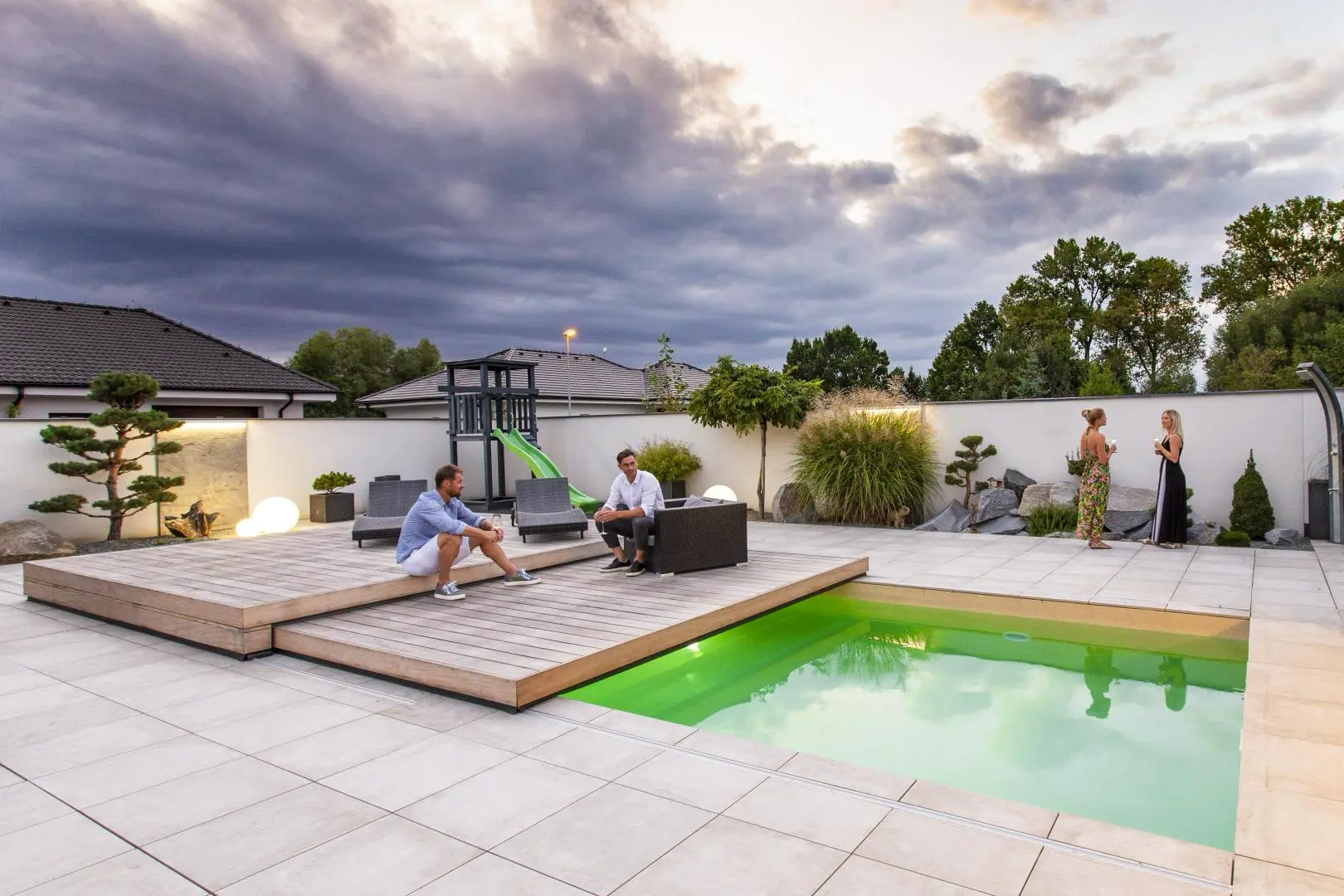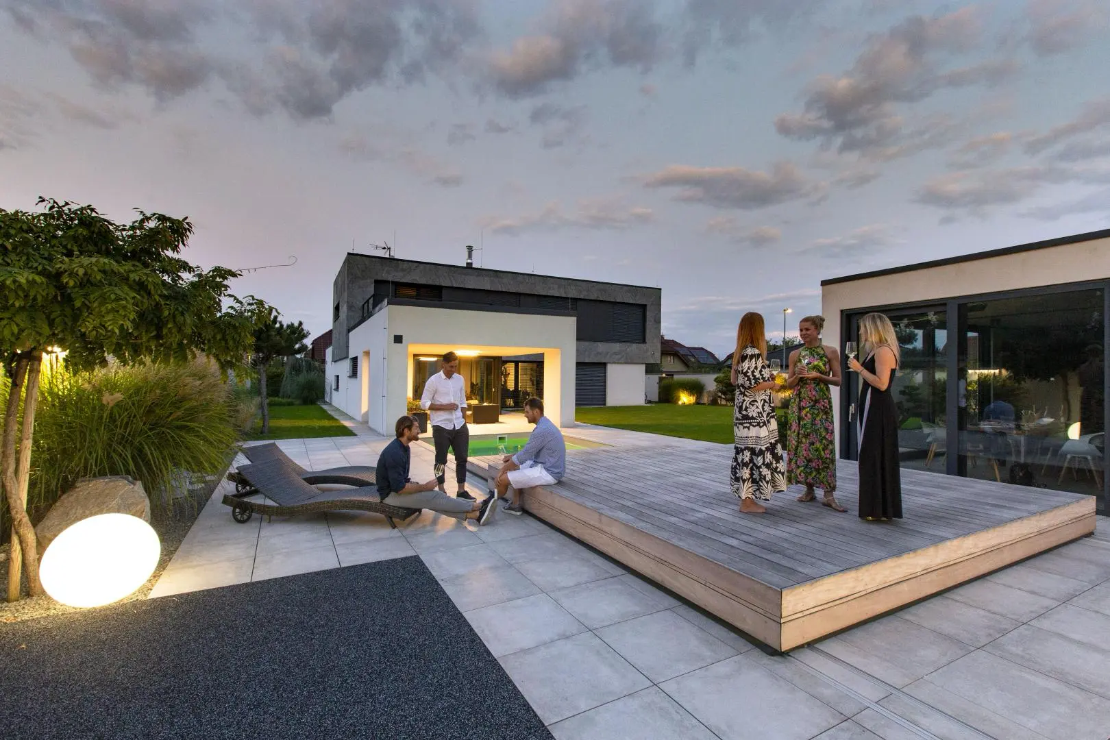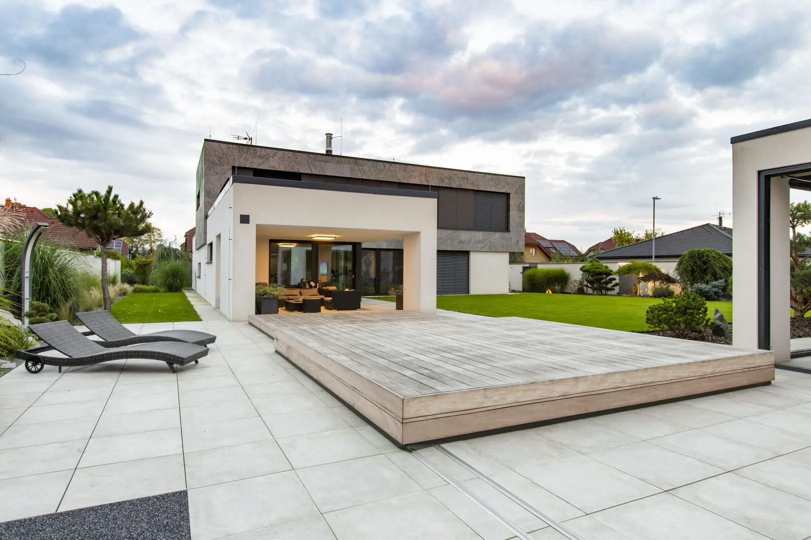 Zastřešení v této realizaci se skládá ze 2 segmentů, přičemž menší segment zajíždí do většího segmentu. Opět se zde ukazuje, jak zastřešení ladí se zahradním konceptem a propojuje přírodu kolem s moderním designem domu. Majitelé domu využívají posuvné zastřešení taktéž jako slunnou terasu k odpočívání, či posezení s přáteli. Design zastřešení podtrhává exotické dřevo garapa.