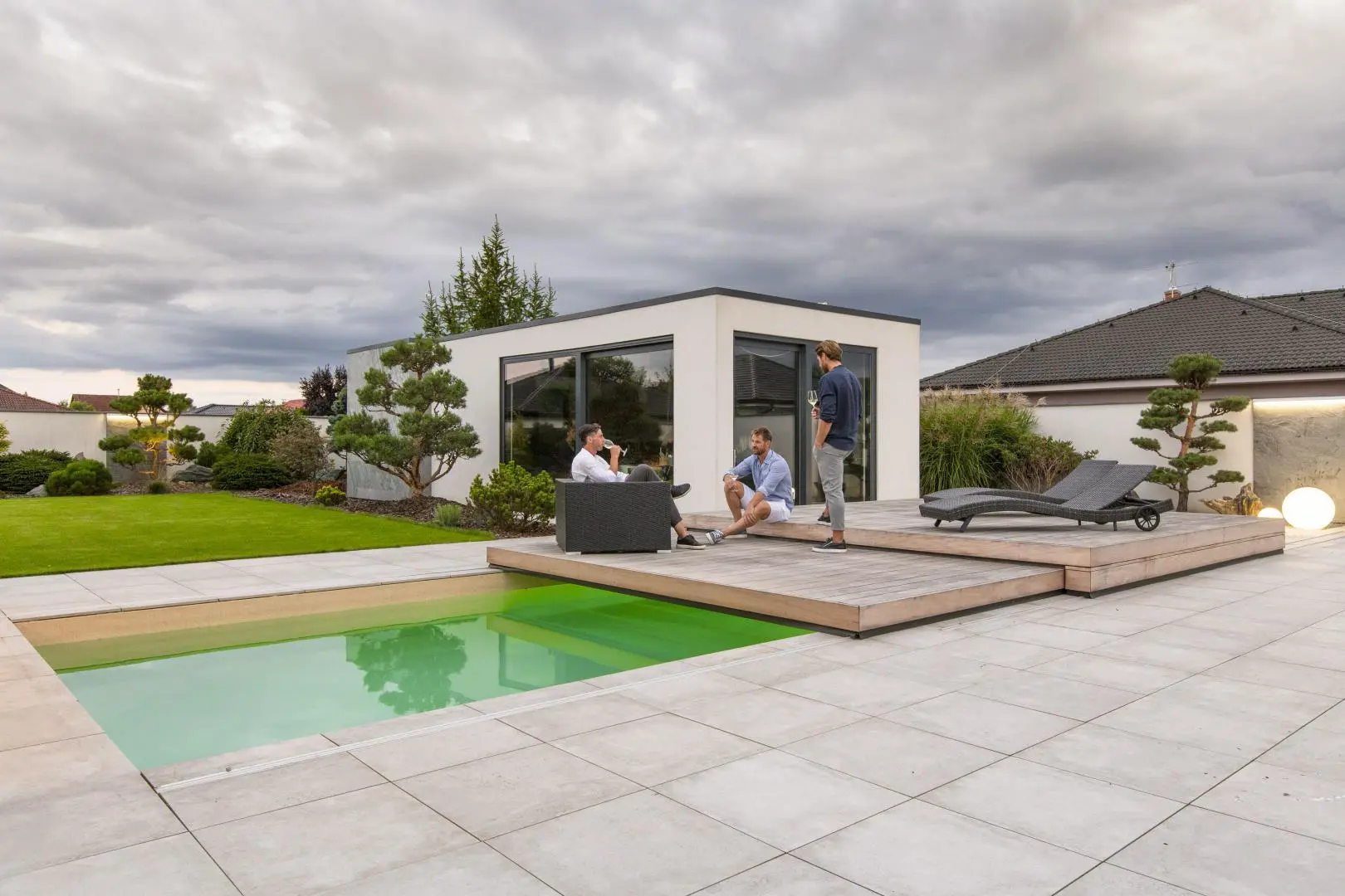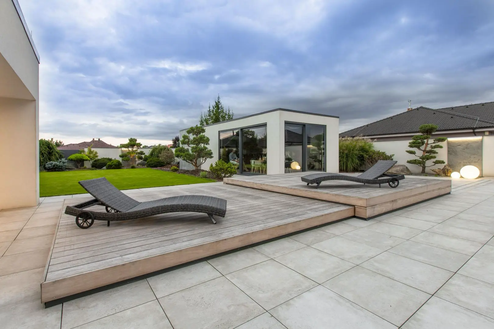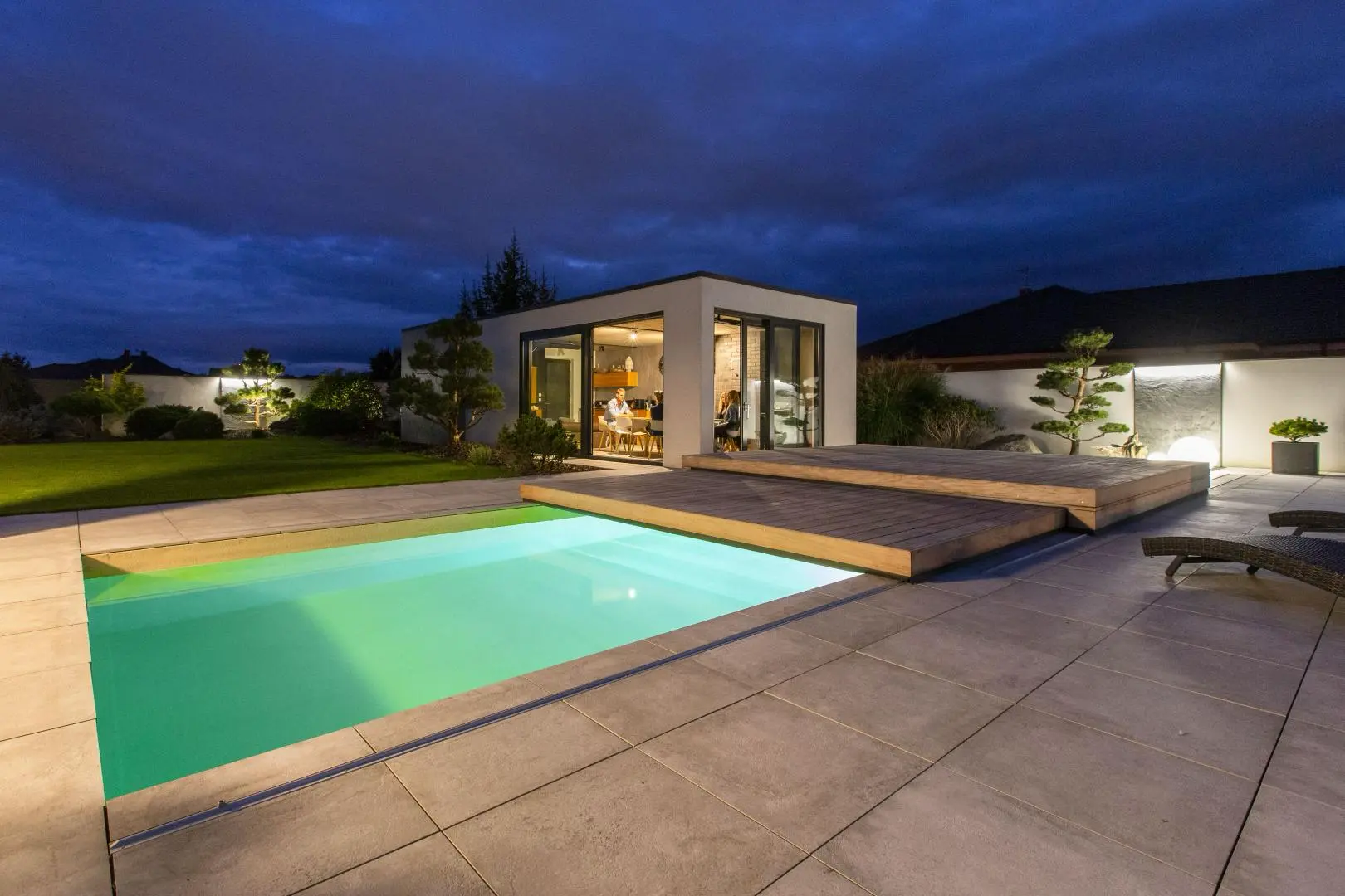 Zastřešení v této realizaci se skládá ze 2 segmentů, přičemž menší segment zajíždí do většího segmentu. Opět se zde ukazuje, jak zastřešení ladí se zahradním konceptem a propojuje přírodu kolem s moderním designem domu. Majitelé domu využívají posuvné zastřešení taktéž jako slunnou terasu k odpočívání, či posezení s přáteli. Design zastřešení podtrhává exotické dřevo garapa.