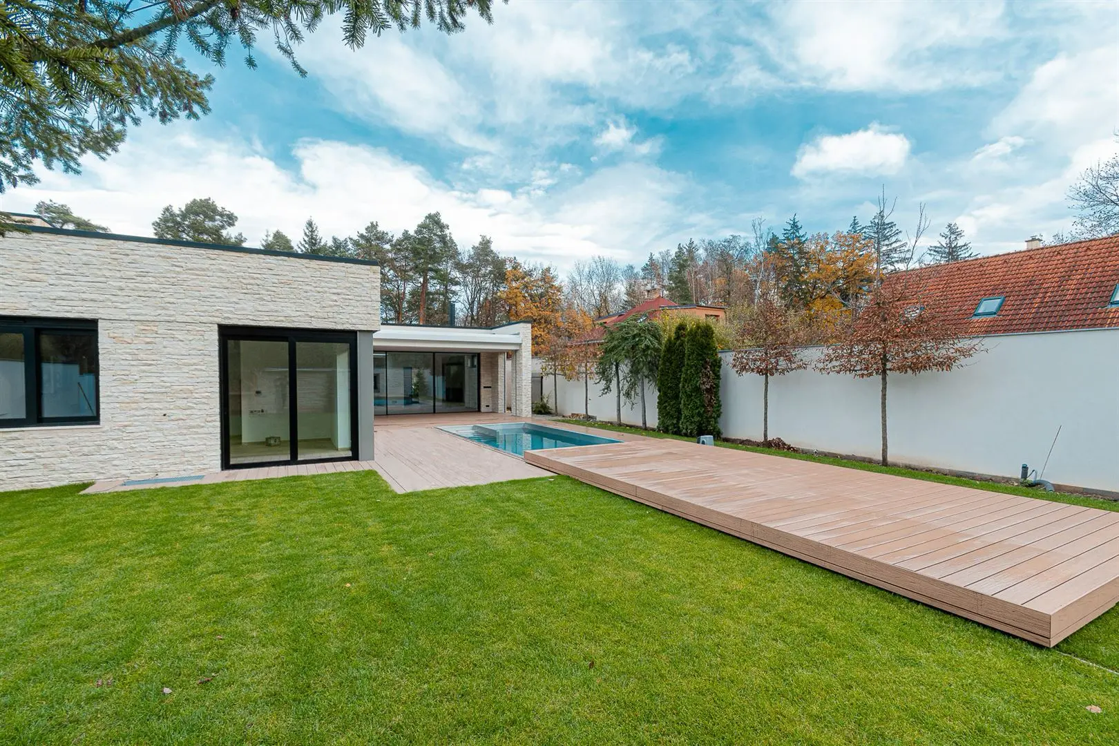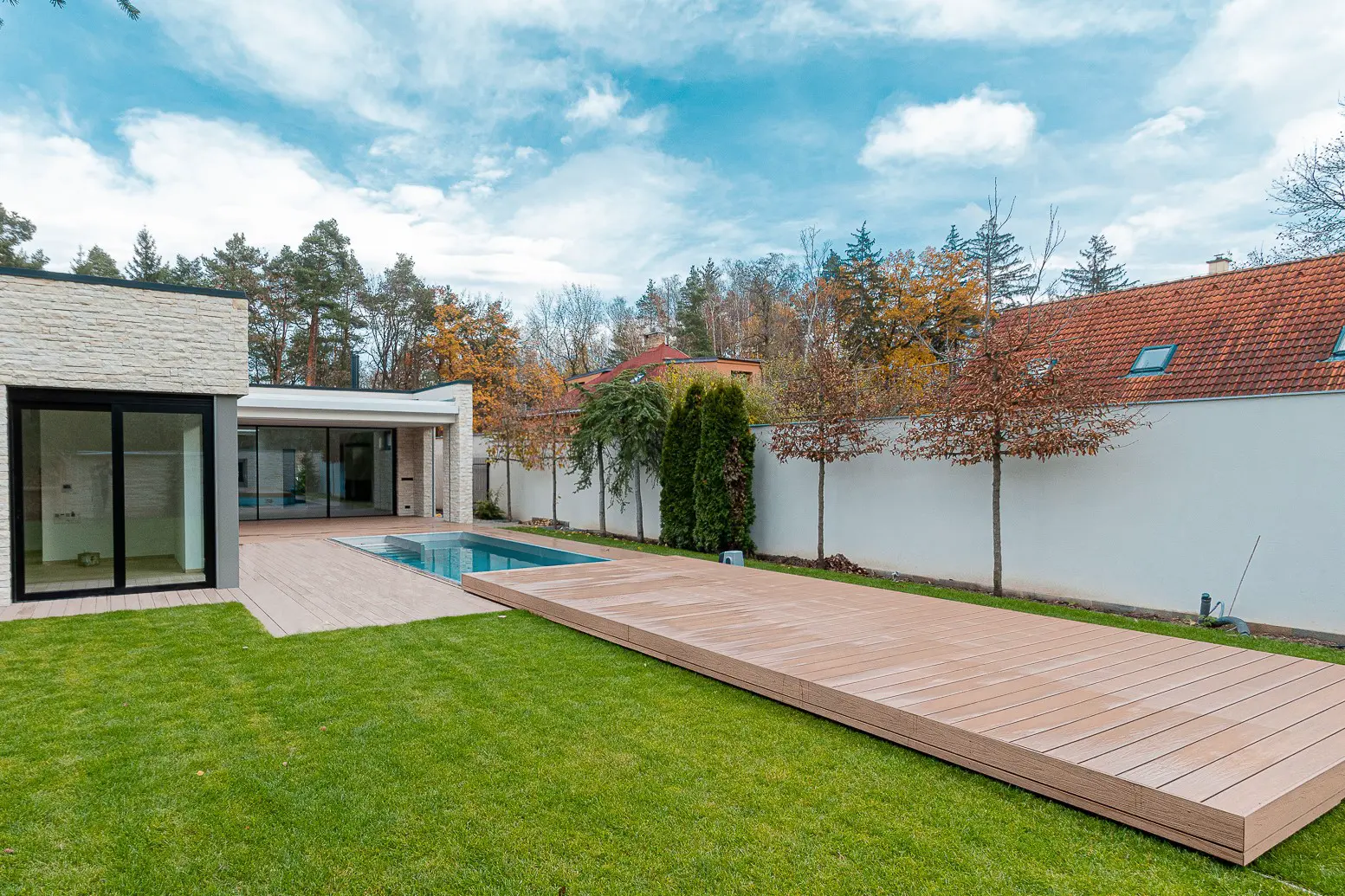Moderní dům, ke kterému se velmi hodí bazénové zastřešení obložené WPC-dřevoplastem.