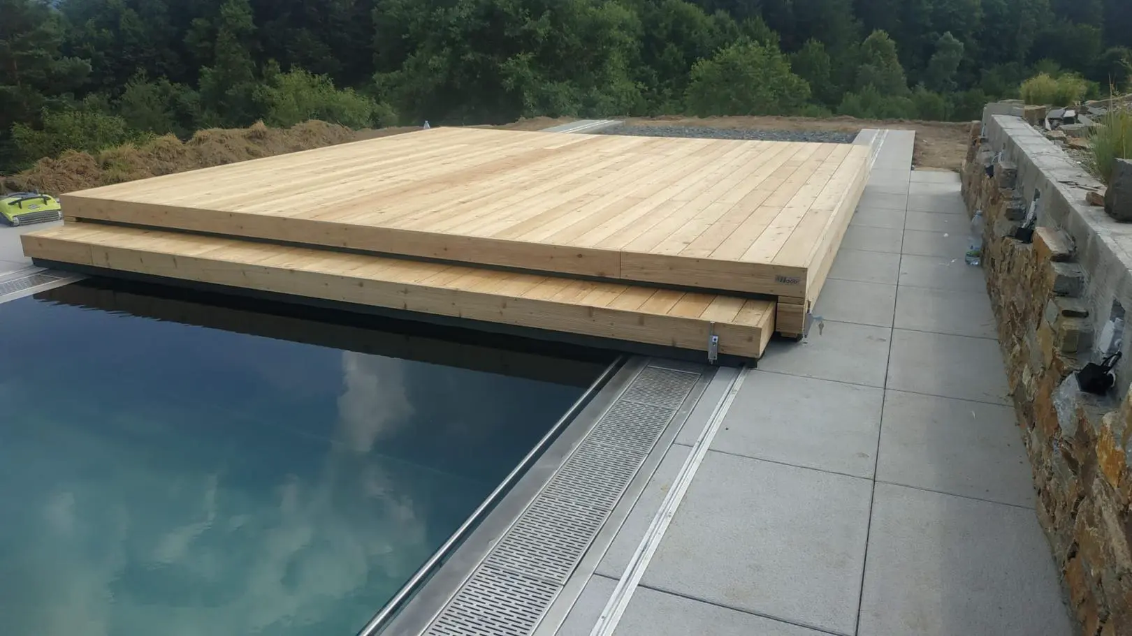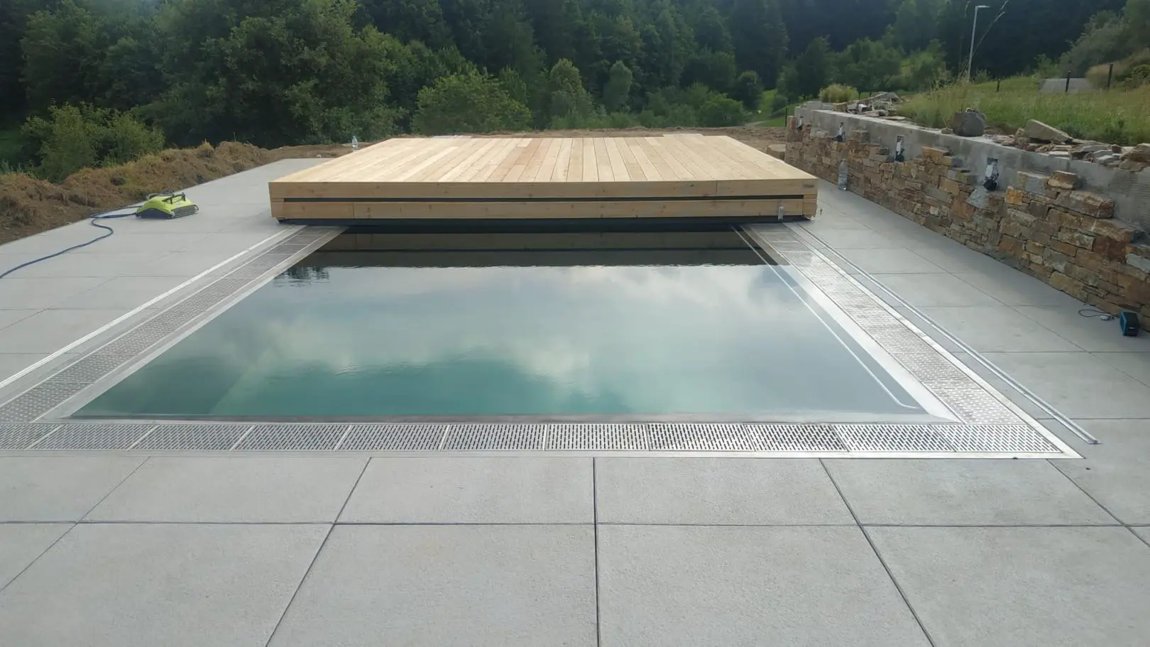 Zde je vidět příkladná ukázka toho, jak designové zastřešení Slide Wood spojuje celý koncept zahrady a rodinného domu. Zastřešení je tvořeno ze dvou dílů, přičemž menší díl zajíždí do většího dílu a oba díly se odsunou za hranu bazénu. Na povrch zastřešení se použily přírodní dřevěná terasová prkna, která se ukazují taktéž na fasádě domu. Přirozenou přírodní atmosféru podtrhává kámen kolem terasy u bazénu.
